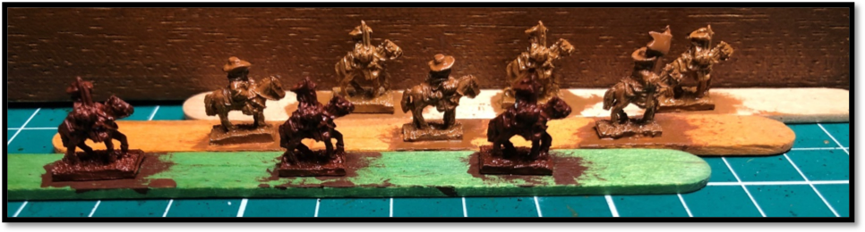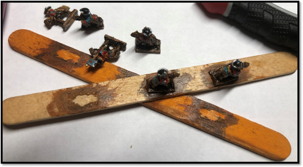 I began by cleaning up the figures. It was only one to be honest as they were very good castings. I filed and clipped the bases short to allow Per maximum space on the base when he comes to base them. I then used a very small dab of superglue to fix them onto the lolly stick ready for their undercoat.