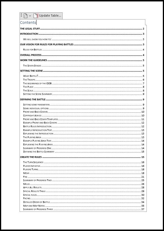 It’s far from the finished article as we now have to work together to sort out the pictures, diagrams and layouts. But it is already just over 15,000 words in 12 sections, written in a wargaming rules style for familiarity. With luck it will have covered all any wargamer would need to start writing a series of rules for battles.